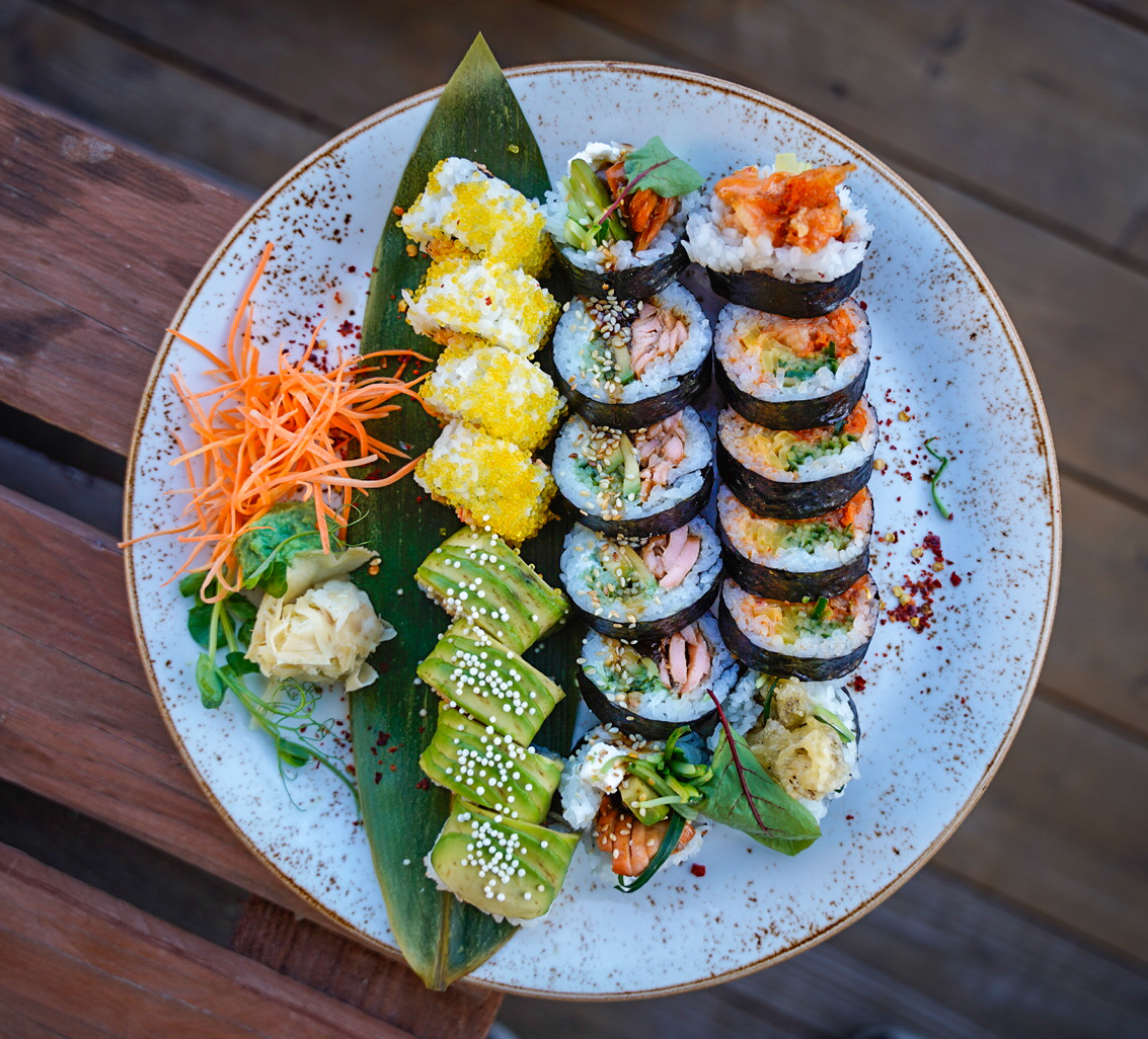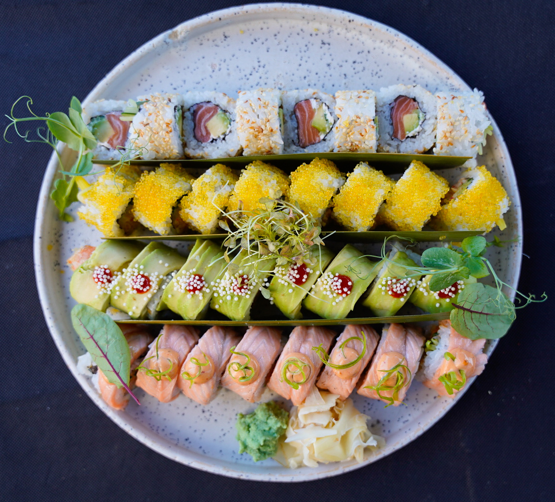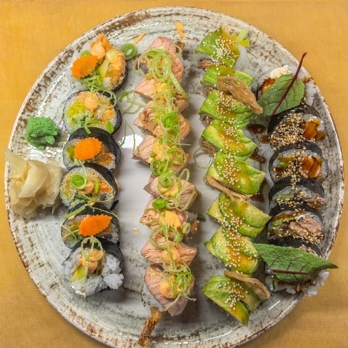 California maki warzywa w tempurze owinięte awokado i sos miso yuzu 4szt. i tuńczyka jalapeno 4szt.