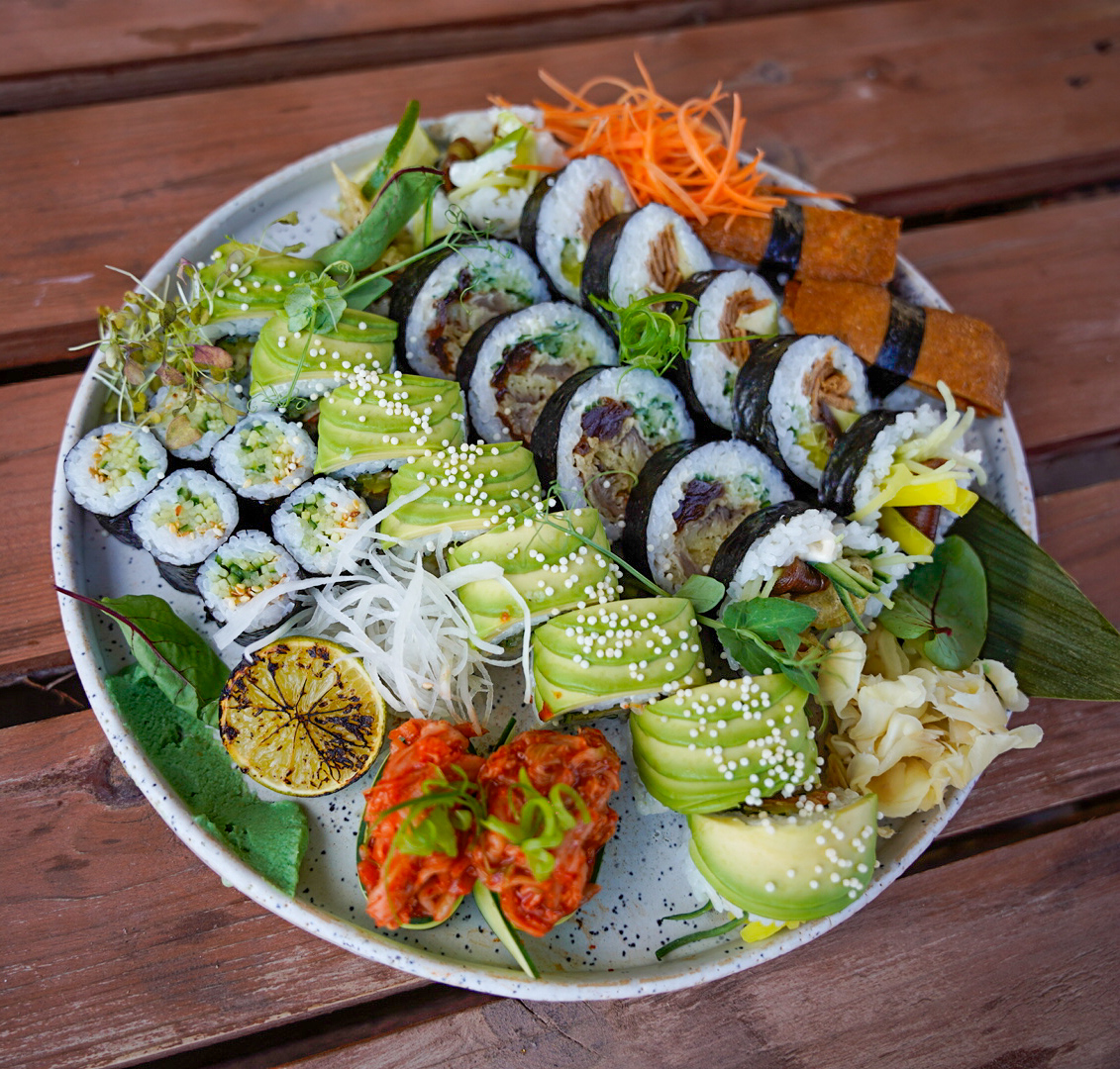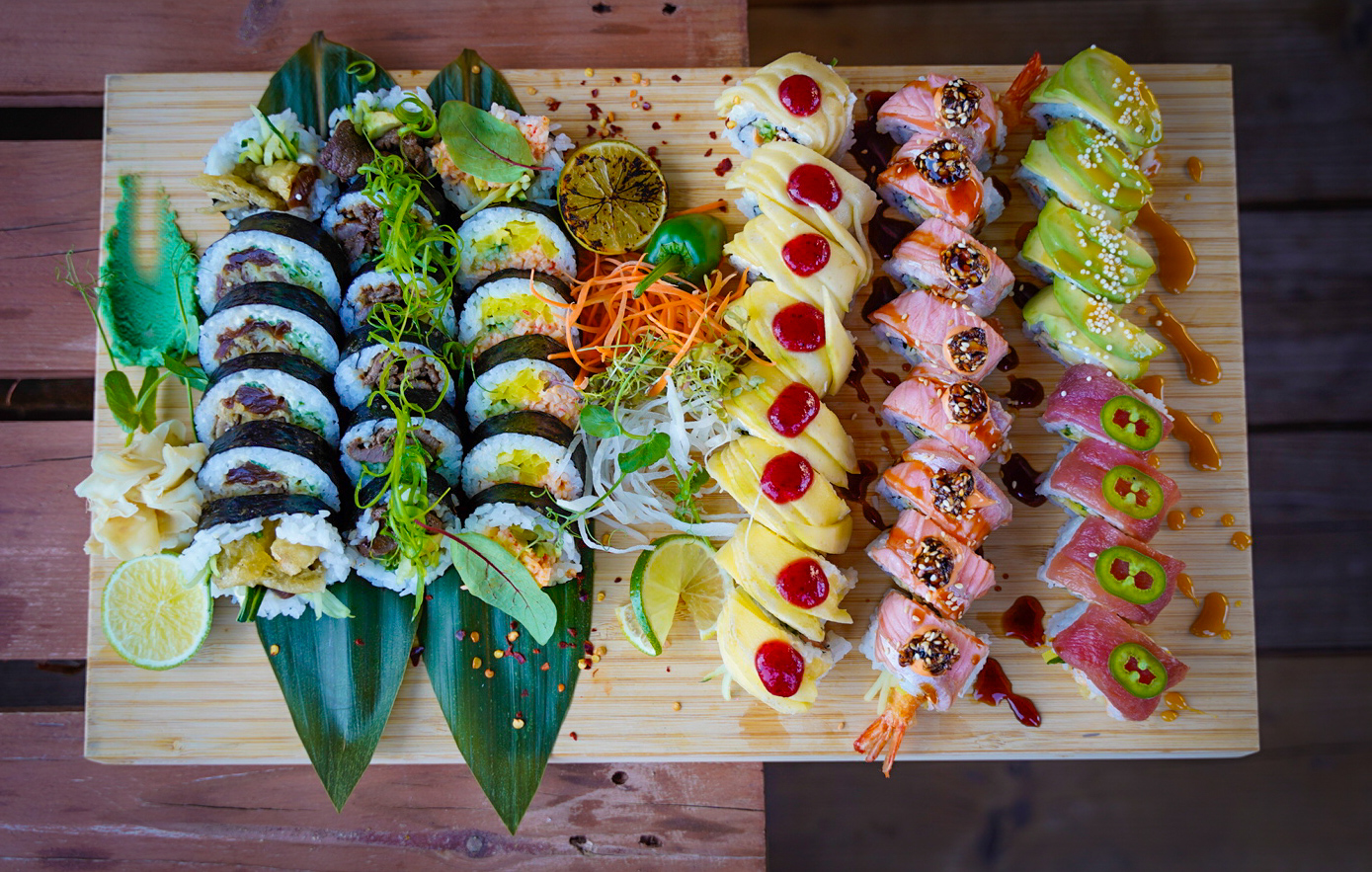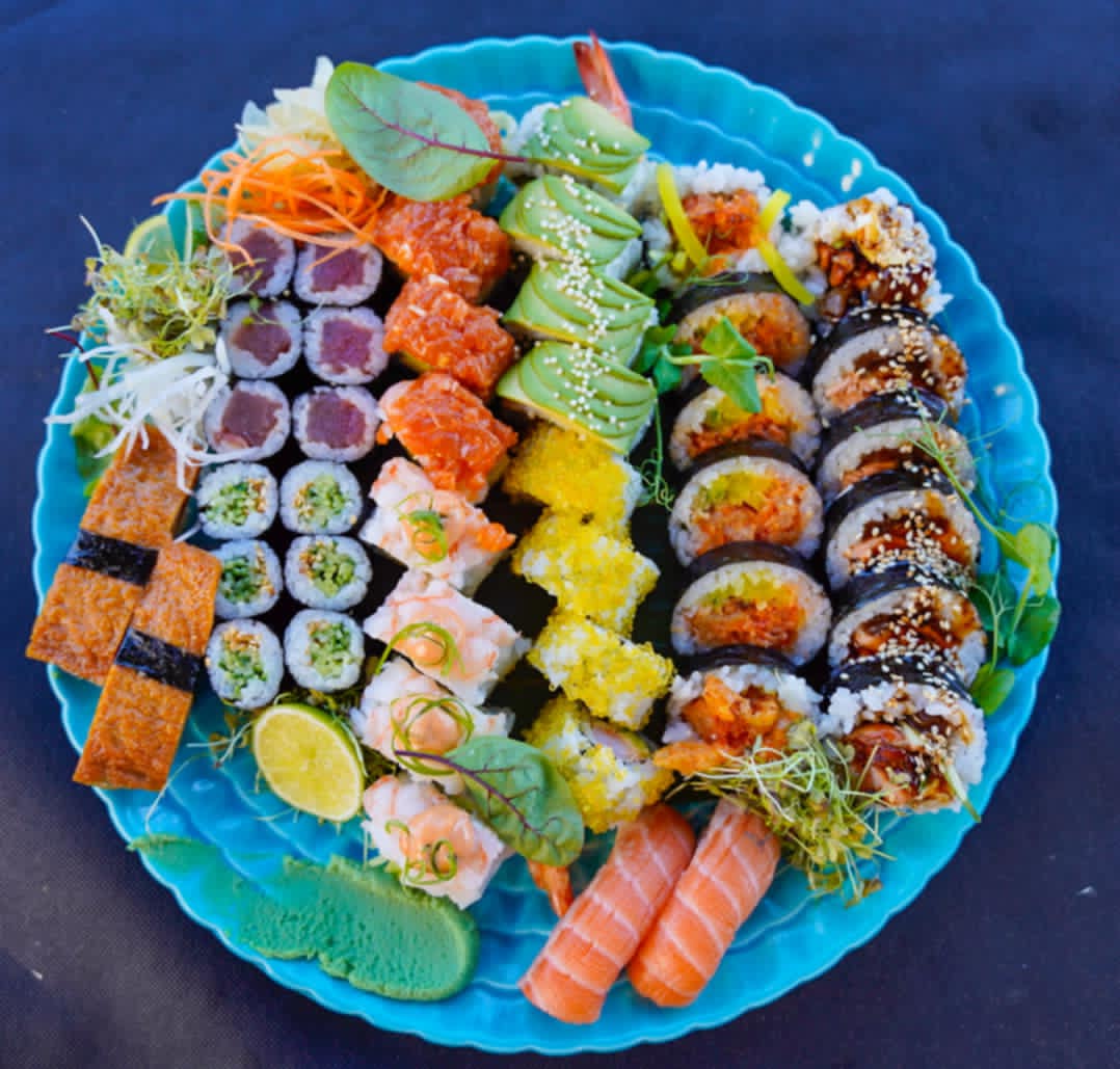 California maki warzywa w tempurze owinięte awokado i sos miso yuzu 4szt. i tuńczyka jalapeno 4szt.